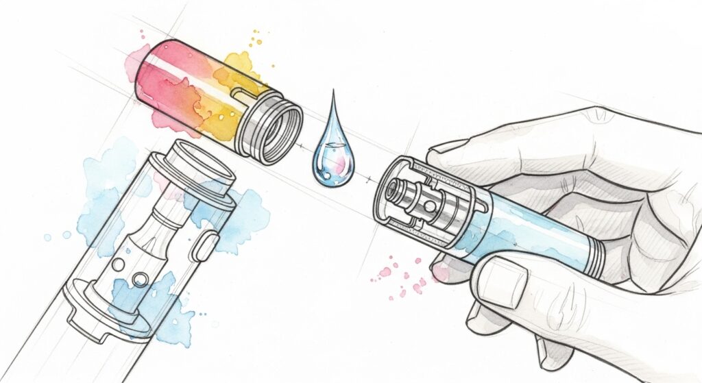 液漏れを防ぐためのコツとしては、強い衝撃を与えないことや、高温になる場所(夏の車内など)に放置しないことが大切です。また、長期間使わない時はカートリッジを本体から外しておき、購入時に付いていたシリコンキャップを付けて保管すると良いでしょう。