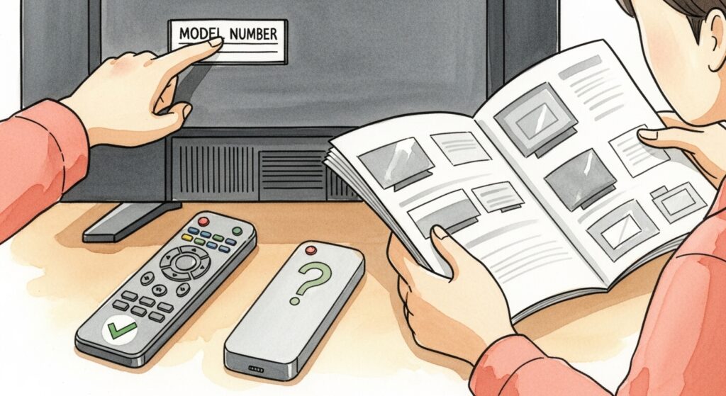 もし手元に説明書がなくて確認できない場合でも、基本的にはテレビの型番さえわかれば、ネット検索で適合するリモコンを見つけることができます。「説明書がないからわからない」と諦める必要はありませんよ。